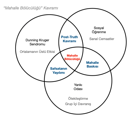Bu üç temel kavram, günümüz insanını farklı bir şekilde etkilese de bazı davranış biçimlerinin yerleşik olması açısından ortak etkiler de yaratıyor. İsterseniz, basit bir diyagramla bu kavramların yarattığı ortak etkinin vücut bulduğu yeni tanımlara bakalım. Üç büyük dairenin kesişim noktaları, dairelerin kapsam dışında kalan alanları ve ikili kesişim sonucunda tetiklenen yeni kavramları merkeze alan alanlar, bir noktada birleşiyor. İşte ben, bu noktada ortaya çıkan kavramın, kişi veya kurumların, ana amaç olarak kullandığı iletişim yöntemleri ve taktikleri neticesinde günlük hayatımıza giren yeni bir bölücülük ortaya çıkardığını düşünüyorum: “Mahalle Bölücülüğü”